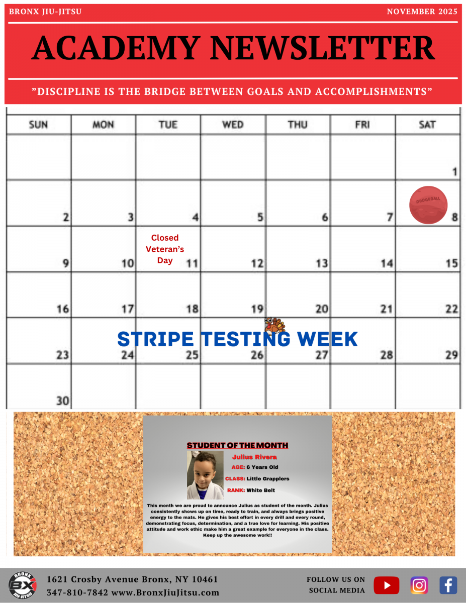 - Veteran's Day - Tuesday, November 11th (No Classes in Session/Academy Closed)