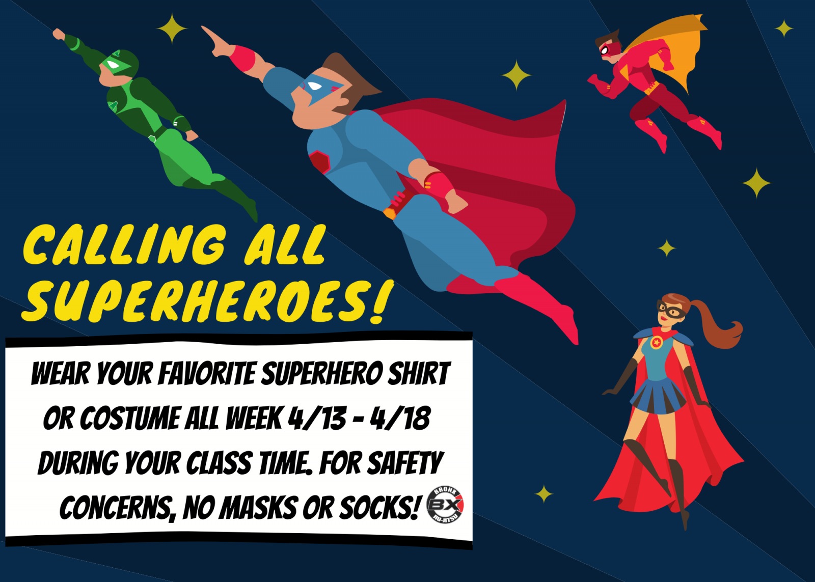 Week of April 13th...Grapplers can come dressed as their favorite superhero or wear their favorite superhero T-Shirt or Pajama (No masks or socks allowed)!